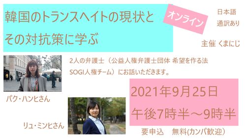先日開催されたオンラインイベント「韓国のトランスヘイトの現状とその対抗策に学ぶ」は、韓国からゲスト二名を招いた豪華な作りでありつつ定員が40名と少なく、参加したくてもできなかった人が多いようだった。そこで、主催者である「くまにじ」さんに許可…