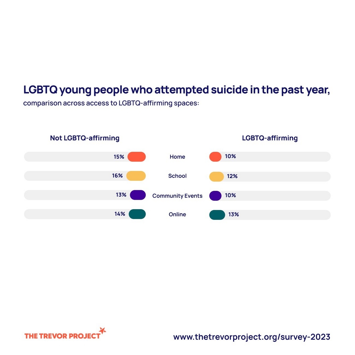 相変わらず若年当事者の希死念慮や自殺を試みる割合は高いが、LGBTQに肯定的な環境があることによってやや改善されることも示されている。特に家族や学校が受容的であることで改善されている。